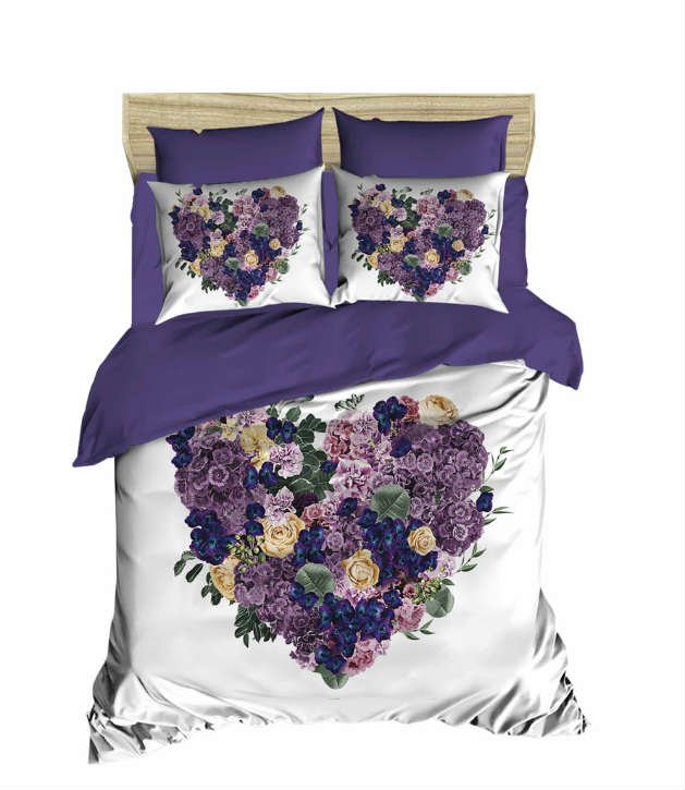 У модели Violette фиолетовая простынь и низ пододеяльника, а верх белый с объёмным изображением сиреневого букета цветов.