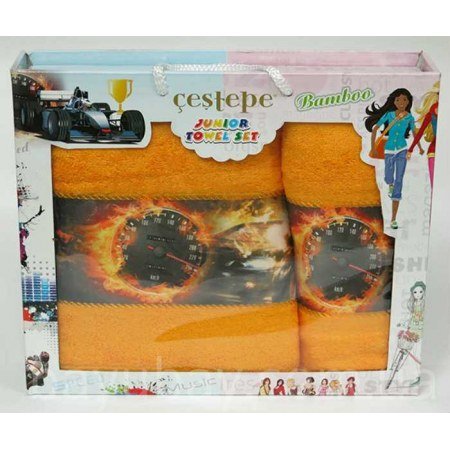 Подарочный набор махровых полотенец с трансферным бордюром, на котором изображена гонка на очень большой скорости, обязательно понравится подростку и любителю гоночных соревнований.